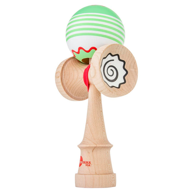 This Kaizen Fish Cake Kendama features our updated silk paint and has been paired with a maple Luna shape ken. Made from cherry wood, each tama sports a verdant green, red, and white 5 stripe design with a fish cake top-spotter, and additional tracking around the bevel. This fresh setup was been weight matched within 7g, and includes a custom designed carrying bag. Savor every trick you lace on this beautiful narutomaki inspired Kendama.