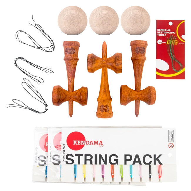 3 Padauk Kendamas for $20!!! The Kaizen Classic 1.0 shape is several years old now, replaced by more modern shapes like the Nova shape or the Jet shape for experienced Kendama players. That means this OG Classic Kendama is priced to move. It makes a great gift for a first time player, or if you’re needing a low-cost set of Kendamas for giveaways or groups. The Tama is not tied on yet, so we include plenty of strings and stringing tools to make the assembly quick and easy.