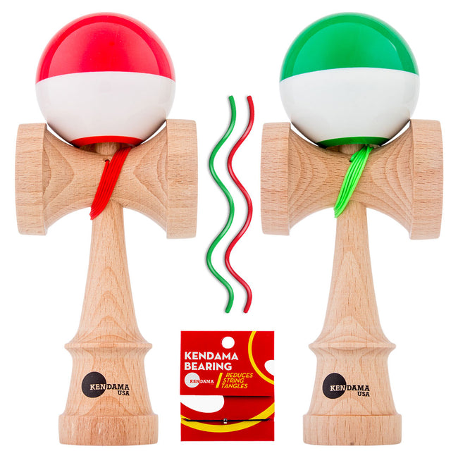 In the spirit of Christmas, this bundle contains a green and red half split Kendama. But that's not all – our Christmas Kendama Bundle also includes extra-long red & green strings, & a replacement bearing.