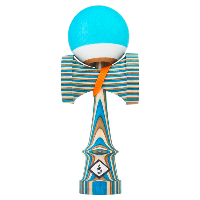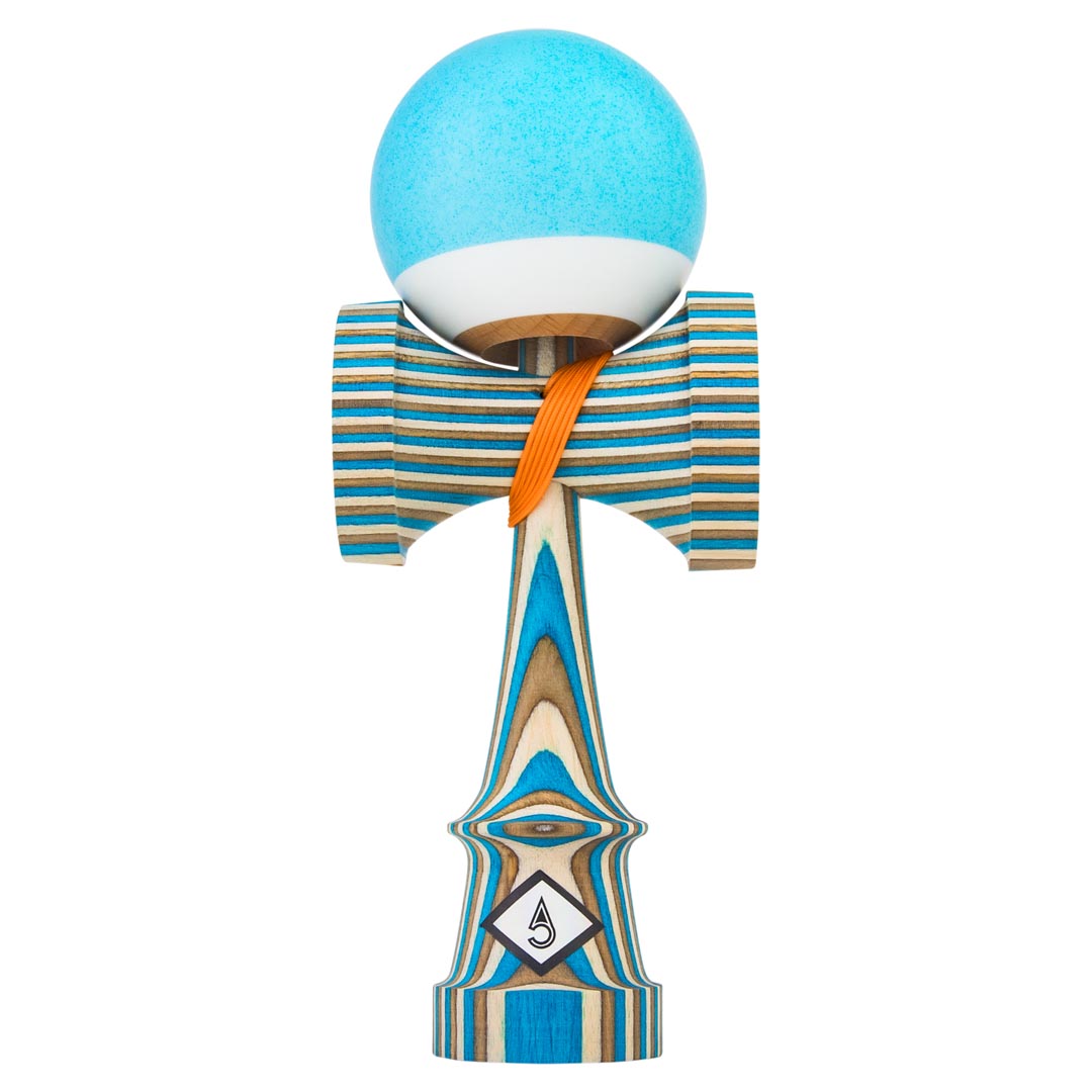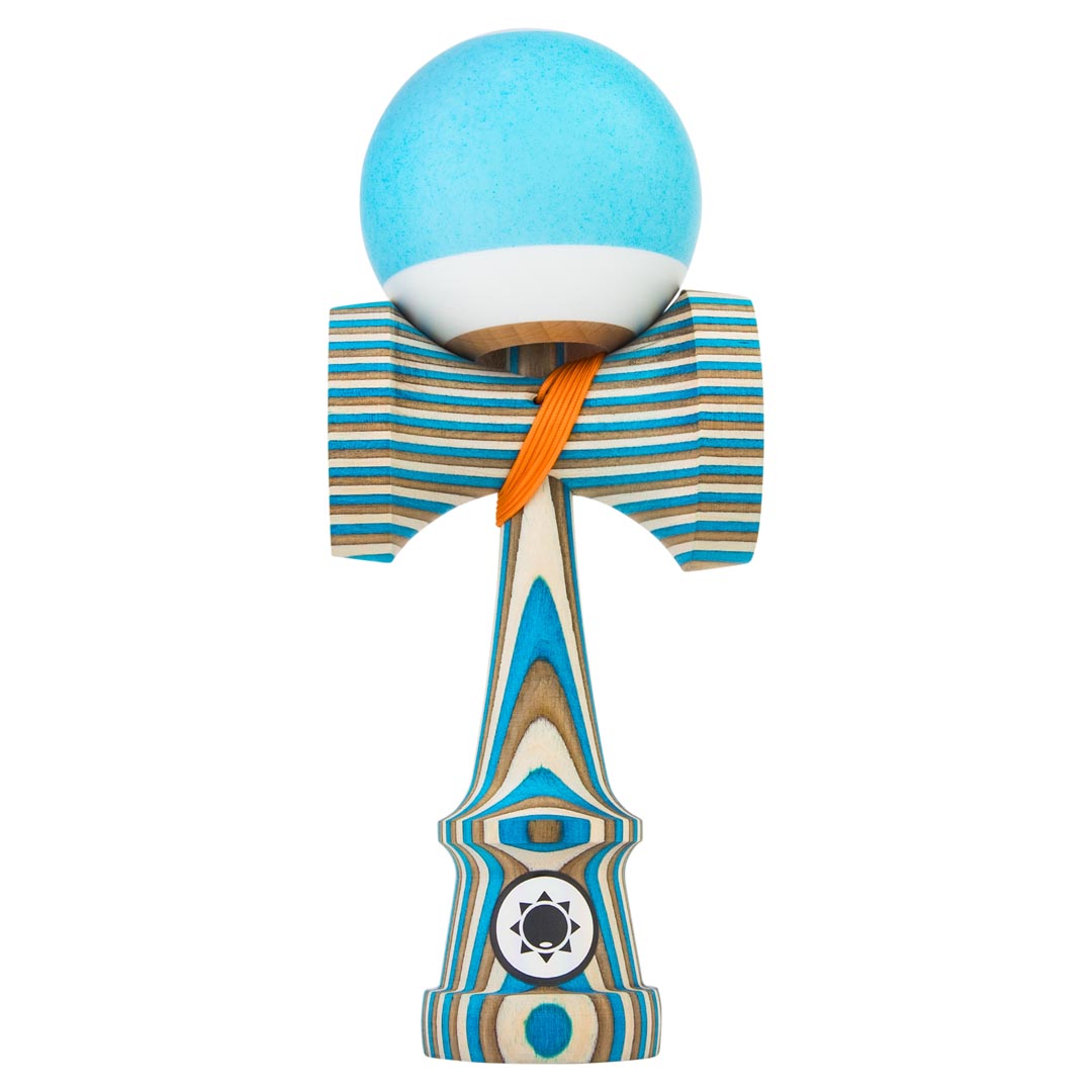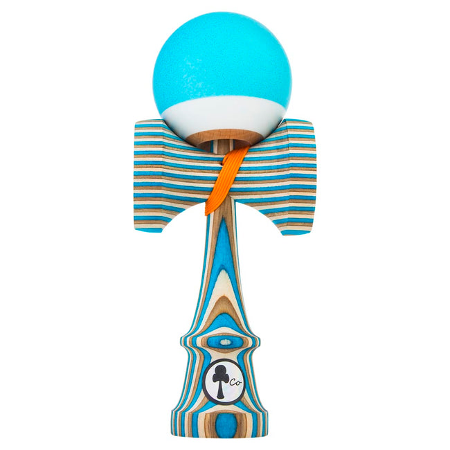 The Blue Reef Spectra Ken is hand-made from slabs of dyed blue, brown, and off-white birch wood that was fused together to create a truly unique Ken. The matching Blue and White Tama adds style and tracking, and is strung with an orange string. This Craft Ken comes in a drawstring bag and is available in your choice of the Jet, Luna, Saga, 2UP, or the new KenCo Zen shape. *Note that that only the Jet Shape will include the 3 burn lines on the Ken.
