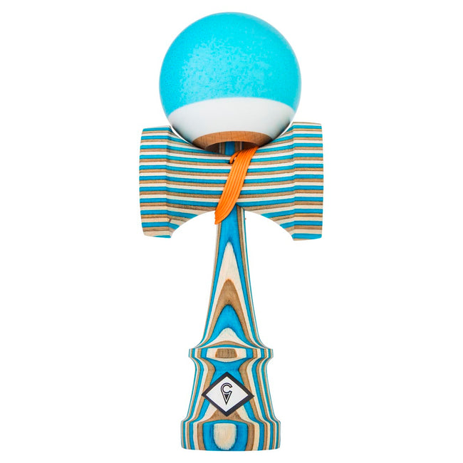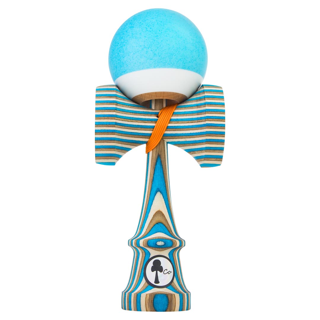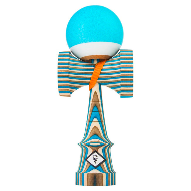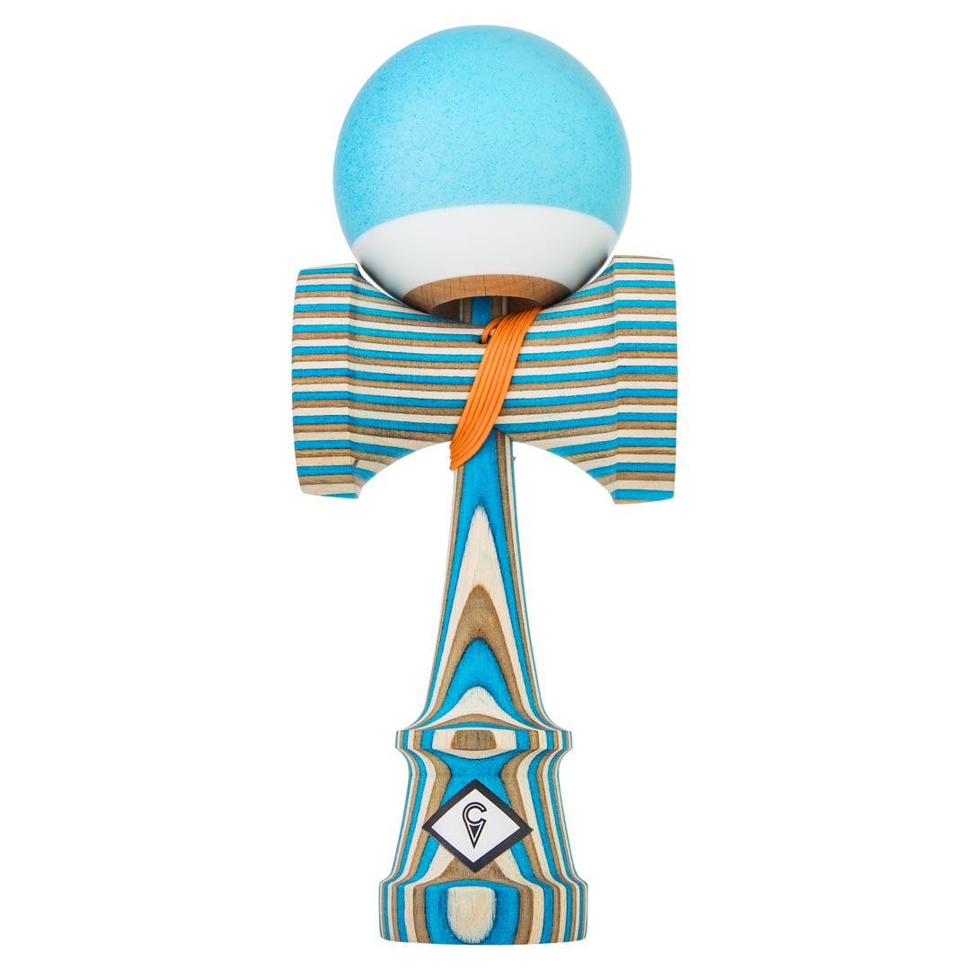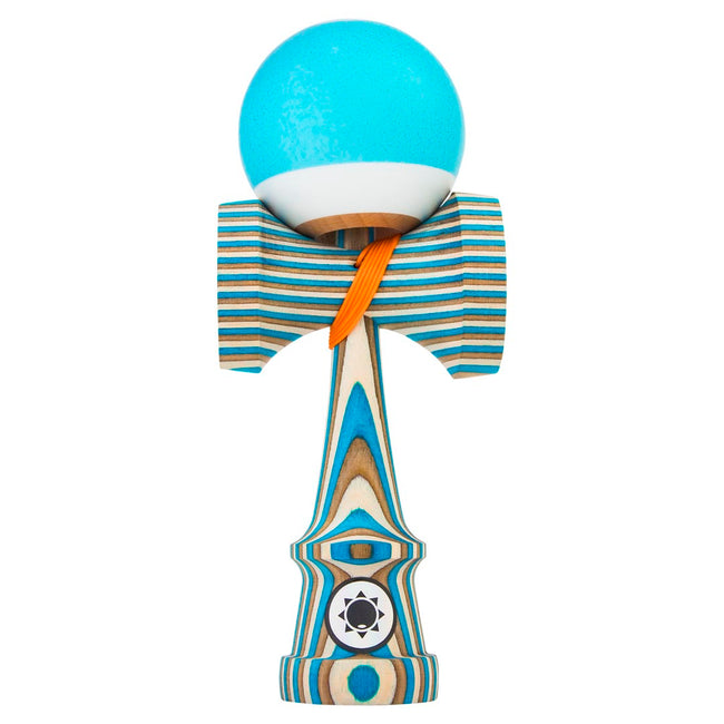 The Blue Reef Spectra Ken is hand-made from slabs of dyed blue, brown, and off-white birch wood that was fused together to create a truly unique Ken. The matching Blue and White Tama adds style and tracking, and is strung with an orange string. This Craft Ken comes in a drawstring bag and is available in your choice of the Jet, Luna, Saga, 2UP, or the new KenCo Zen shape. *Note that that only the Jet Shape will include the 3 burn lines on the Ken.