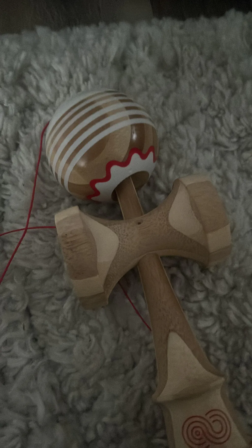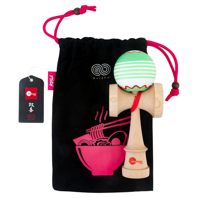 This Kaizen Fish Cake Kendama features our updated silk paint and has been paired with a maple Luna shape ken. Made from cherry wood, each tama sports a verdant green, red, and white 5 stripe design with a fish cake top-spotter, and additional tracking around the bevel. This fresh setup was been weight matched within 7g, and includes a custom designed carrying bag. Savor every trick you lace on this beautiful narutomaki inspired Kendama.