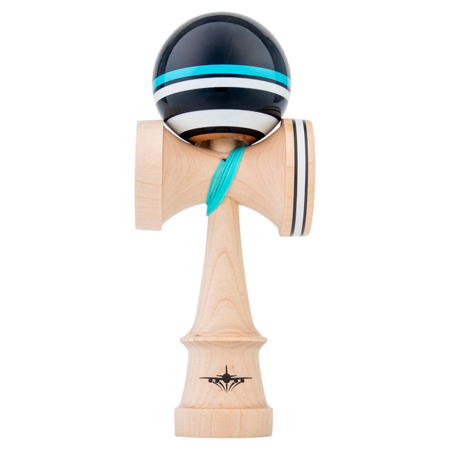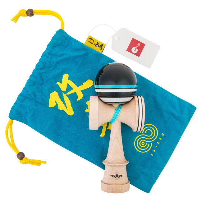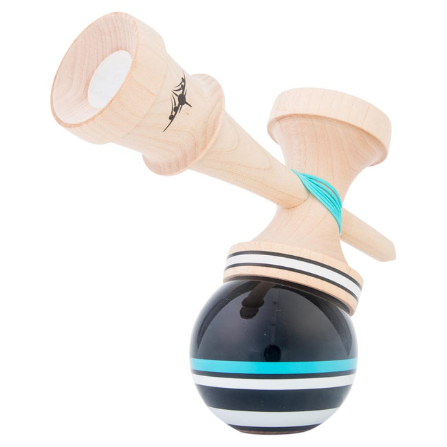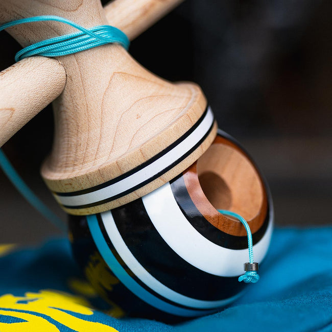 The Kaizen Manta features a black & white 80/20 split tama with a vibrant blue and white stripe at its center, plus black and natural bevel stripes. We're excited to offer this combination with the Kaizen Jet Ken, providing exceptional tracking & precision. These Kendamas have Maple Kens with Cherry wood tamas, complete with a matching top dot, bevel outline, sport stripe on the big cup, and painted base cup hole. Each setup has been weight matched within 7g. The Manta tama has been coated in our super stick paint and strung up with an extra long matching blue string. We've packed each one into a special Kaizen bag. Dive deep to unlock a world of unlimited possibilities and creative trick combinations on the Kaizen Manta Kendama.