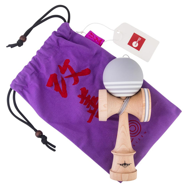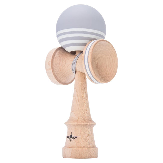 This Kaizen Sunrise Stripe features a grey & white colorway, and is coated in our rubberized silk paint. Our silk paint has a smooth and tacky feel, providing the right amount of stick while still allowing for adjustments during balance tricks. This cherry tama is coupled with a maple Jet shaped ken, and has been weight matched within 7g. We've added a matching sport stripe on the big cup, and a painted base cup hole to aid with tracking.