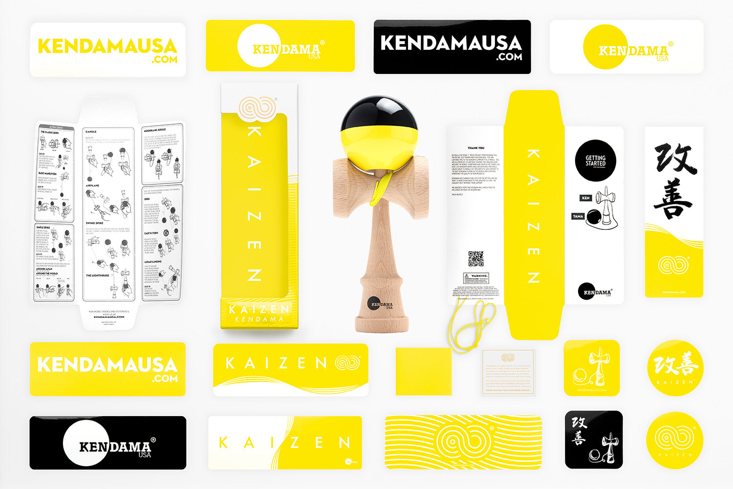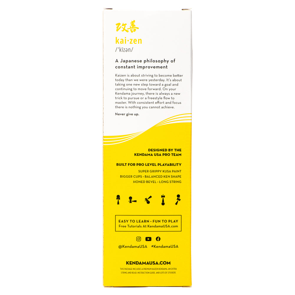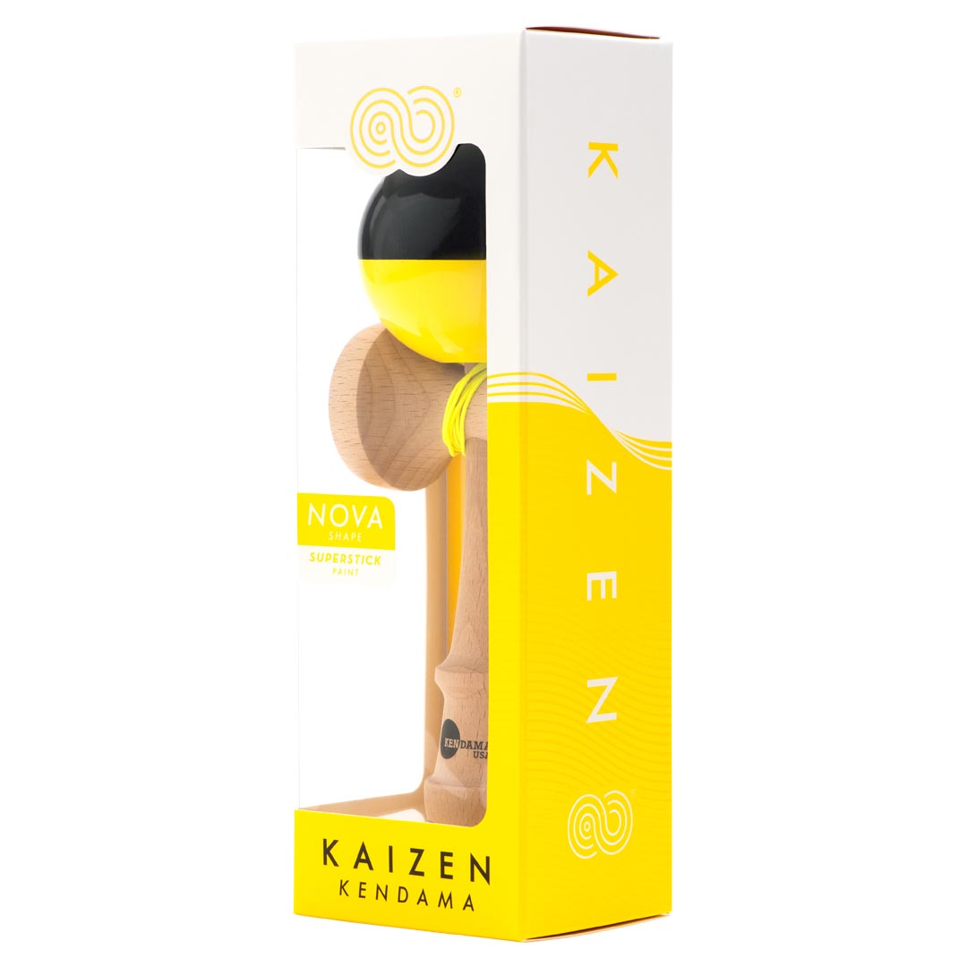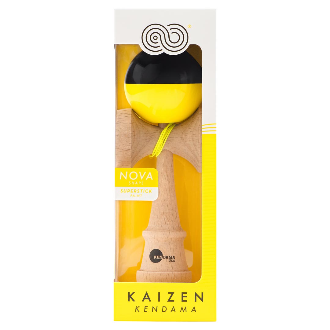Kaizen Half Splits are designed for Pro level playability at an entry-level price. Our classic yellow and black half split design helps you easily track the ball as it rotates during tricks. We have added several important tracking elements including a top dot on the tama, an engraving on the rim of the big cup, a painted stripe around the bevel, and a painted base cup hole. The matching yellow string is extra-long to make juggling easier. Our KUSA Super Stick paint is grippy and will help you lock in precision balance tricks like lunar and lighthouse. The tama (ball), sits on a Jet shape Ken (handle) which was meticulously designed in the USA by our Pro Team.