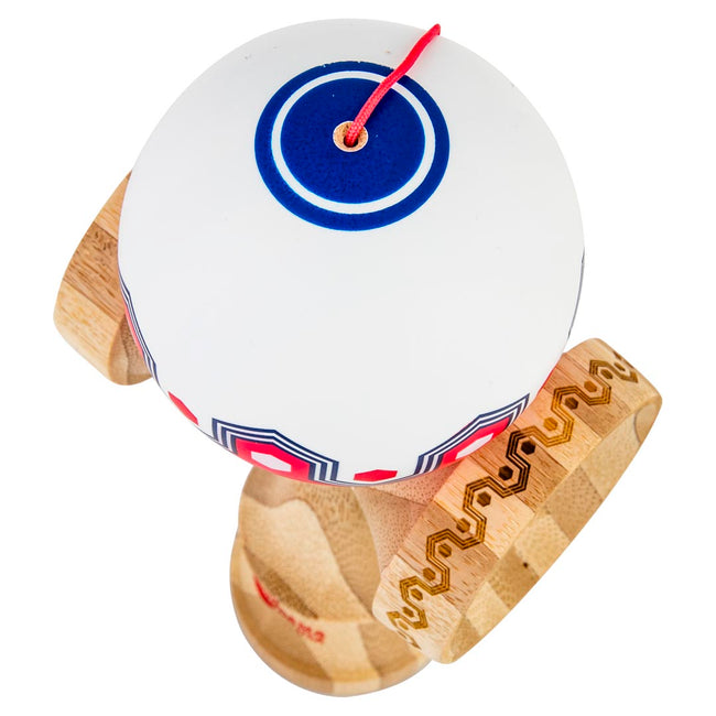 This Kendama features a red and white tama split by a blue geometric pattern around the center of the tama. The bevel ring, top spotter, and matching engraving on the rim of the big cup make this beauty easy to track and fun to play. We've coated this in our updated silk paint and paired it with a bamboo Jet shaped ken that is weight matched within 7g. Each Kendama includes a customized bag.