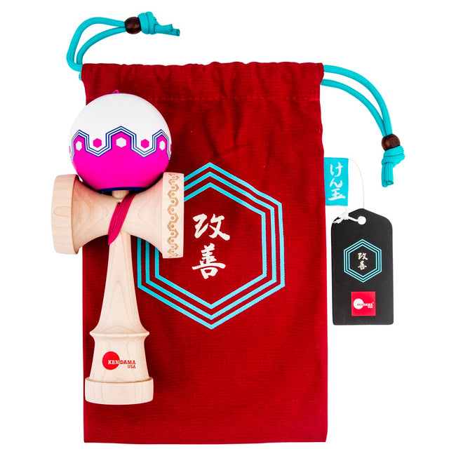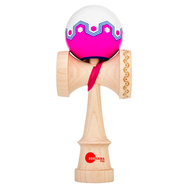 This Kendama features a black and white tama split by a blue geometric pattern around the center of the tama. The bevel ring, top spotter, and matching engraving on the rim of the big cup make this beauty easy to track and fun to play. We've coated this in our updated silk paint and paired it with a maple Luna shaped ken that is weight matched within 7g. Each Kendama includes a customized bag.