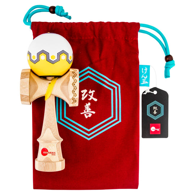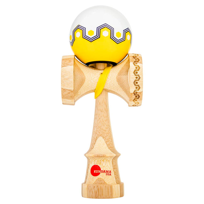 This Kendama features a white and yellow tama split by a deep blue geometric pattern around the center of the tama. The bevel ring, top spotter, and matching engraving on the rim of the big cup make this beauty easy to track and fun to play. We've coated this in our updated superstick paint and paired it with a bamboo Luna shaped ken that is weight matched within 7g. Each Kendama includes a customized bag.