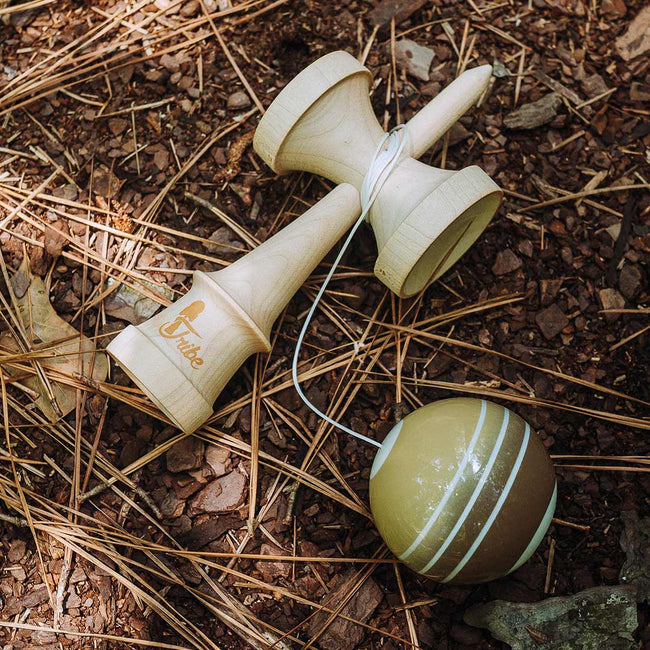 The Woodland Tribe Model Kendama features a timeless earth tone faded tama with white triple stripes and is coated with our latest superstick paint. It includes a white top dot and bevel outline that complements the colors and improves tracking. We've paired this beech wood tama with a maple Jet Shape ken that is weight matched within 7 grams. This Kendama was designed by Tribe team member Chandler Gantt. It comes packaged in a customized Tribe bag and includes a replacement string, bearing, and stringing tool.