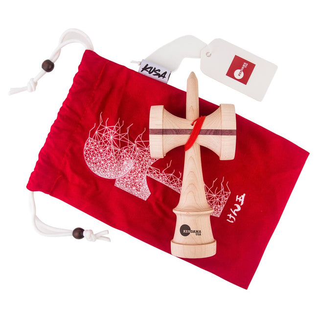This spliced Jet-shaped Ken features the unique purple hues that can rarely be found in other wood types. Purpleheart is an exotic wood that can easily be considered one of the strongest and densest woods available on the market. It comes pre-strung with a red string and bearing, and packed in a special red drawstring bag to maintain the pristine appearance of your Kendama.