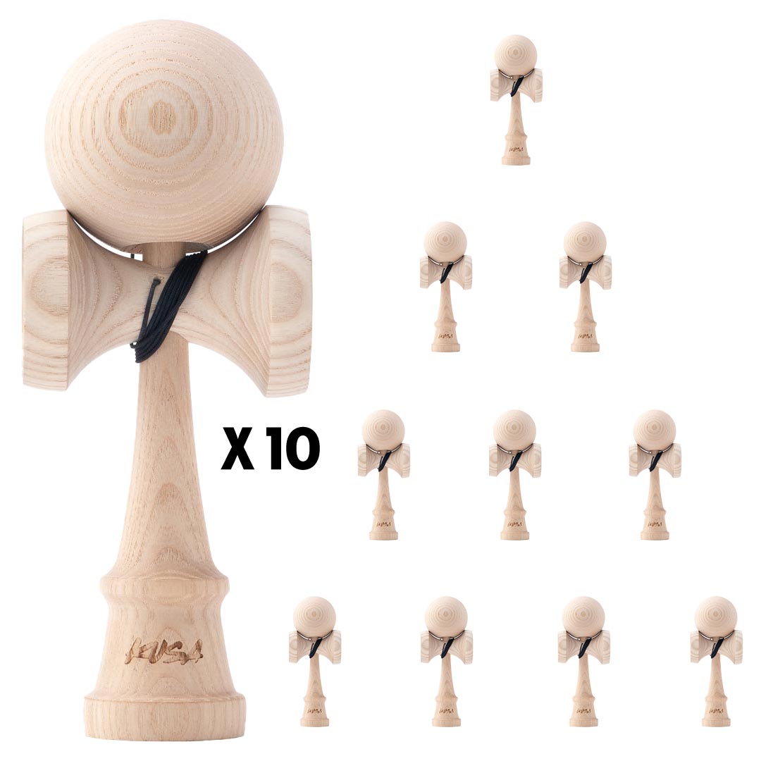 Our Kendama Party Bundle includes 10 complete Kendamas made entirely of ash wood. Each one comes bubble wrapped with an extra string and bearing and tucked nicely inside a blue muslin Kaizen bag to keep it safe from the elements.