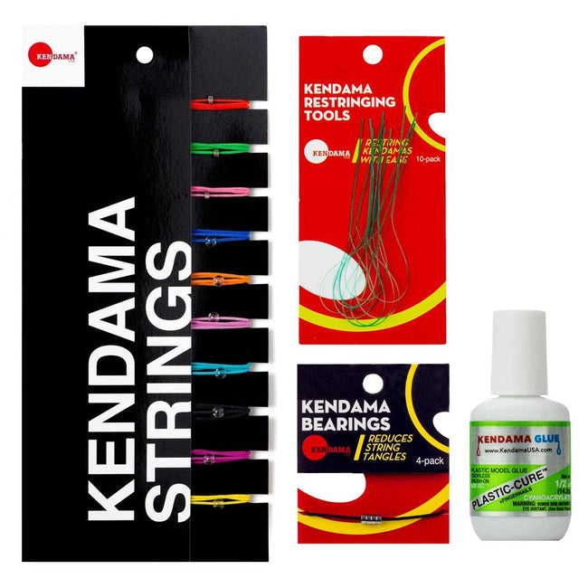 Our Kendama prep kit bundle includes 11 extra long strings in various colors that you can use to personalize your setup, restringing tools that will make switching your strings and re-stringing a breeze, 7 spinner bearings for no-tangle setups, and glue to protect your spike tips.