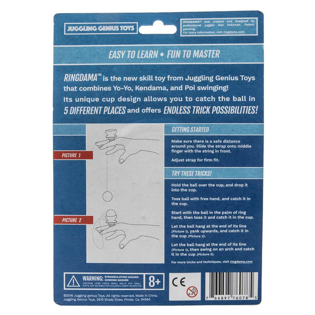 RINGDAMA™ is a skill toy from Juggling Genius Toys that combines Yo-Yo, Kendama, and Poi swinging. Its unique cup designs allows you to catch the ball in 5 different places and offers endless trick possibilities.