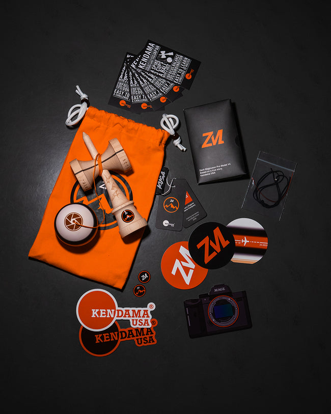 The Zach Magnuson V4 Pro Model Kendama is inspired by his life, travels, and tattoos. The tama features a white, black, and orange striped color scheme. The top of the the ball features an engraved camera shutter design and the middle of the tama shows a travel themed graphic from some of Zach's favorite worldwide destinations. Its coated in our Silk AS2 paint and includes a crushable bevel rim.