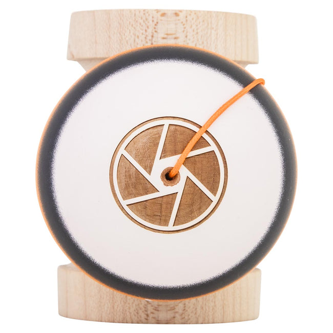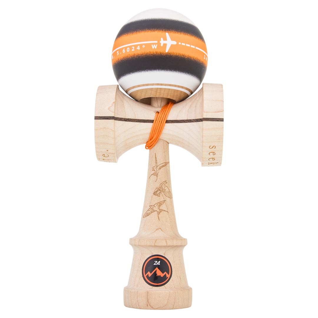 The Zach Magnuson V4 Pro Model Kendama is inspired by his life, travels, and tattoos. The tama features a white, black, and orange striped color scheme. The top of the the ball features an engraved camera shutter design and the middle of the tama shows a travel themed graphic from some of Zach's favorite worldwide destinations. Its coated in our Silk AS2 paint and includes a crushable bevel rim.